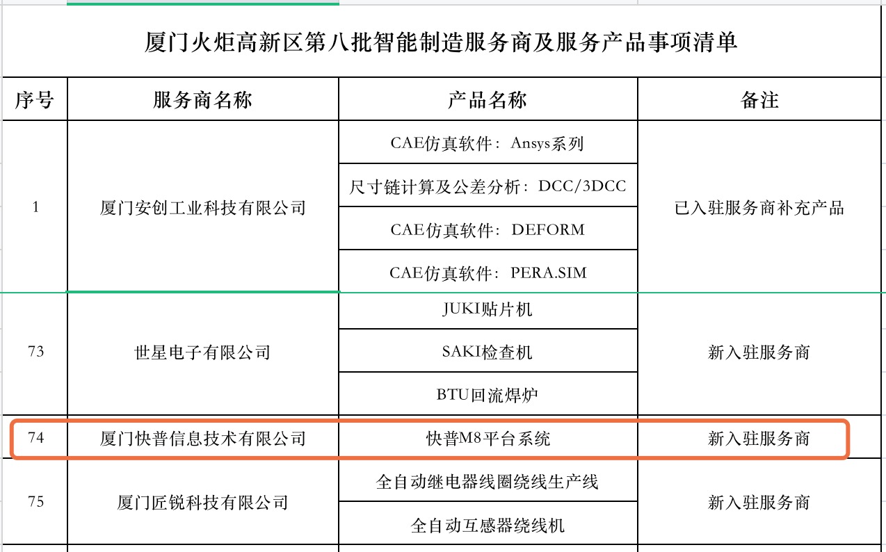 近日,廈門火炬高新區(qū)管委會公布第八批“火炬智能制造服務(wù)商”和“智能制造產(chǎn)品服務(wù)”,經(jīng)服務(wù)機構(gòu)申報、運營單位初審、業(yè)務(wù)處室復(fù)審、專家組評審等環(huán)節(jié),廈門快普信息技術(shù)有限公司及自主研發(fā)產(chǎn)品“快普M8平臺系統(tǒng)”正式入選。