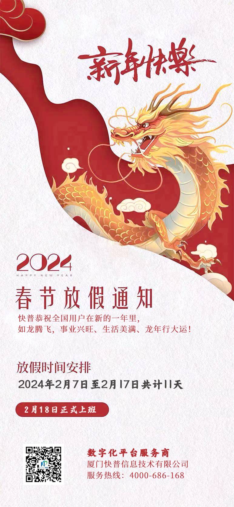 2024年春節(jié)即將到來,快普公司全體員工提前恭??炱沼脩粼谛碌囊荒昀铮堮R精神,龍騰虎躍,事業(yè)如日中天,生活步步高升!感謝您長期以來對我們工作的理解和支持。
